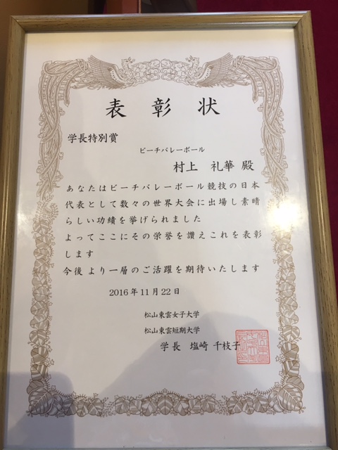 ビーチバレーボールで活躍している村上礼華が、学長特別表彰を受賞しました。