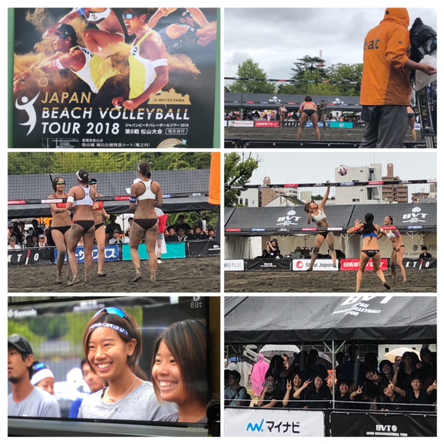 ビーチバレージャパンツアー2018松山大会が9/1.2に城山公園特設コートで開催されました。城山公園に800tもの砂を運んでコートが作られ、初日はあいにくの天候で400人、2日は天候も良く1400人の来場者だったそうです。