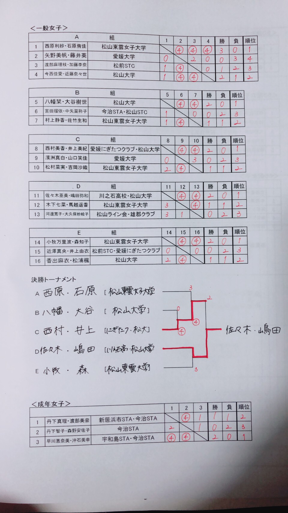 小牧・森ペアと西原・石原ペアが第3位という結果でした。対戦相手、ゲームカウントは写真の通りです。