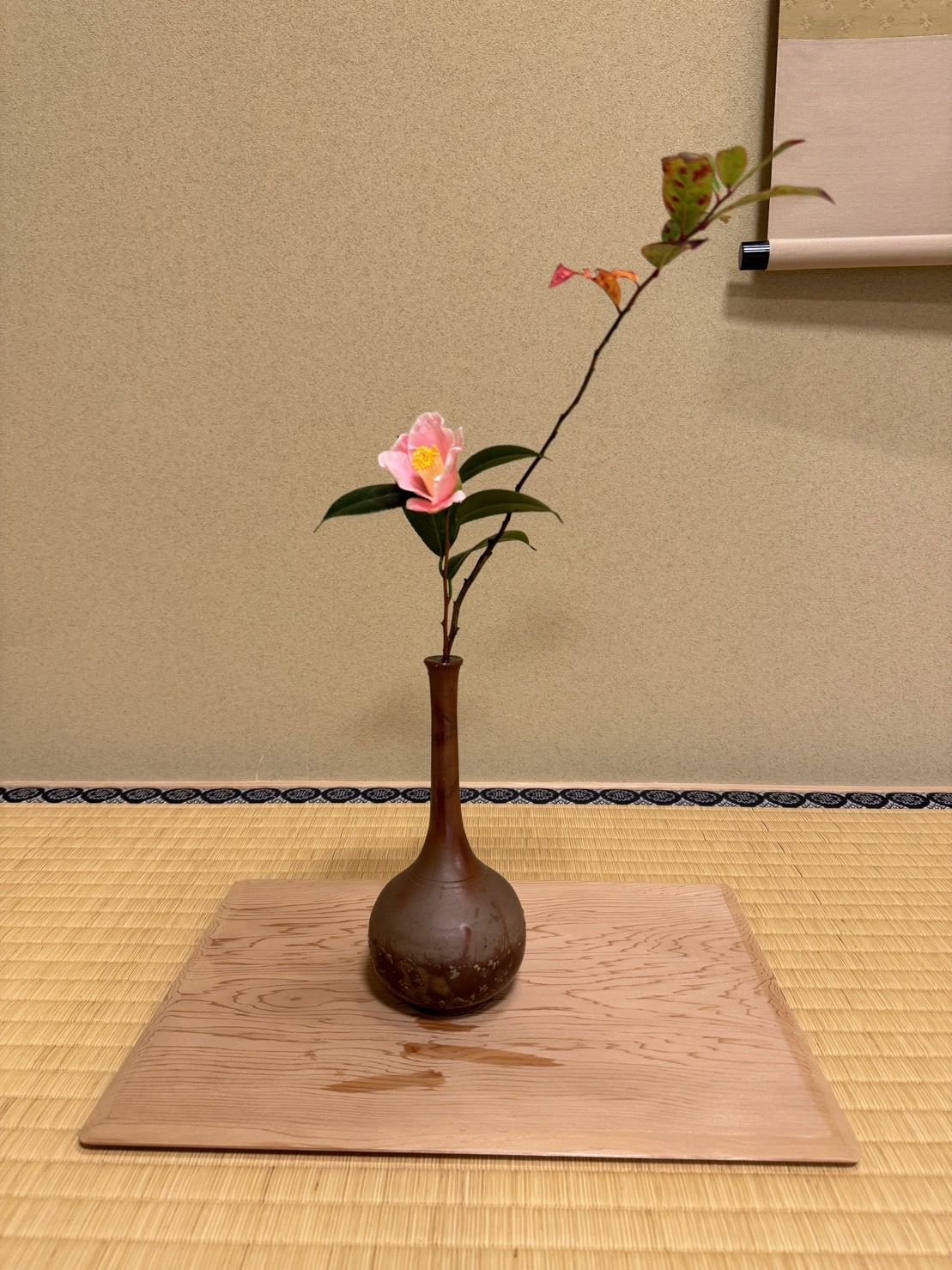 お花は侘助(わびすけ)です。椿の一種で、本来茶室の床に椿を活ける際は蕾のものを選びますが、この侘助は小振りのため開花したものを活けます。華やかな椿とはまた違い、控えめで可愛らしいですね。