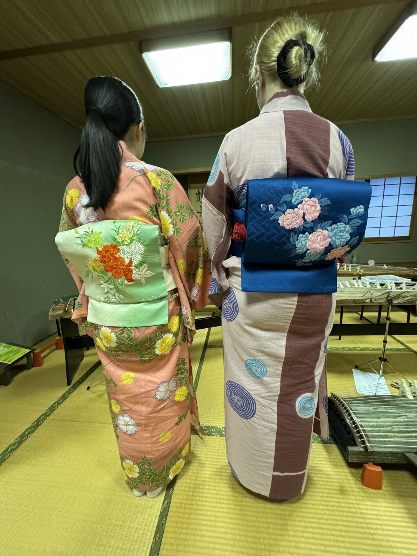 帯は先生が九寸、私たちは八寸を使い、かがり名古屋帯で、一重お太鼓結びを練習しました。