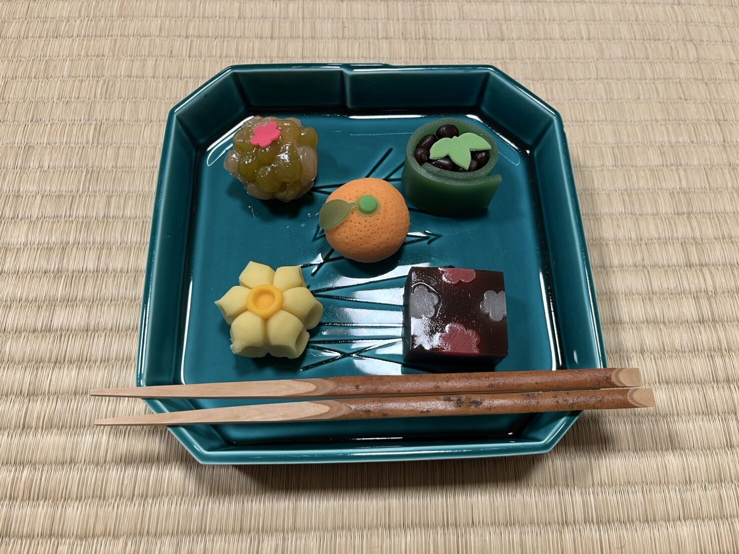 お菓子: みかん、若竹、羊羹、水仙