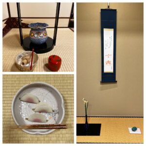 お正月から日が経っており、お正月気分は抜けつつありましたが、新年の縁起物の絵が入ったお道具や新年に食べられる花びら餅、宝船と回文歌の掛け軸で揃えられた茶室を見て新年のワクワク感をもう一度味わうことができました。