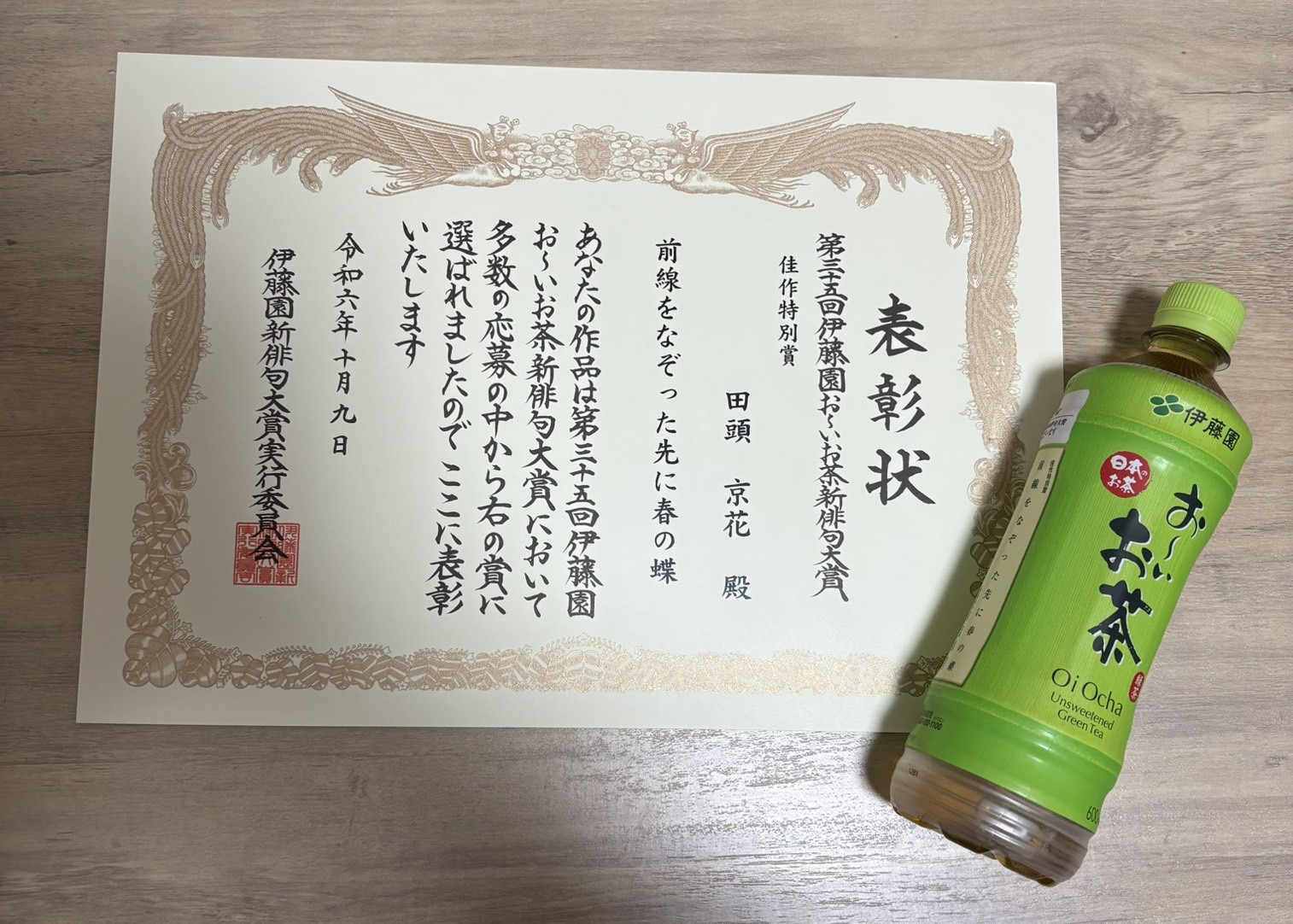 「第35回お~いお茶新俳句大賞」の結果が発表され、部長であり女子大学3回生の方が「佳作特別賞」を受賞しました!おめでとうございます!