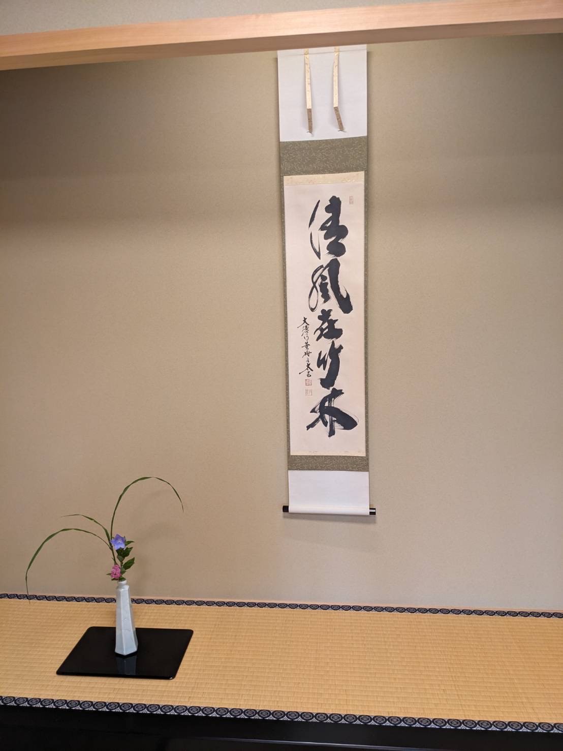 先生が少しでも涼しさを感じられるようにと「清風在竹林」の掛軸を選んでくださりました。