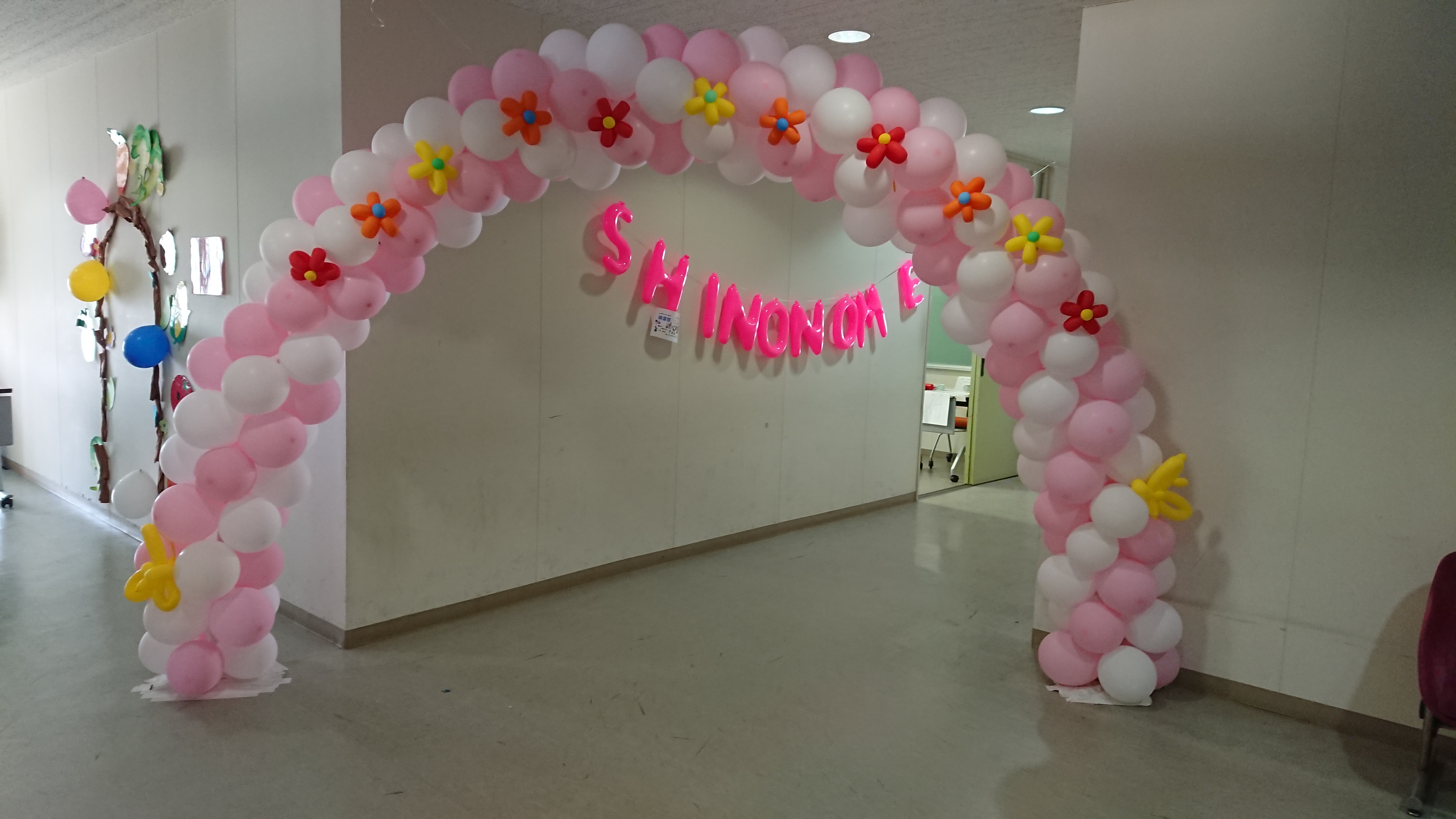5月25日(土)に保護者の方々をお招きしたイベントがあるとのことでしたので、A館の入り口の飾りつけを行いました。