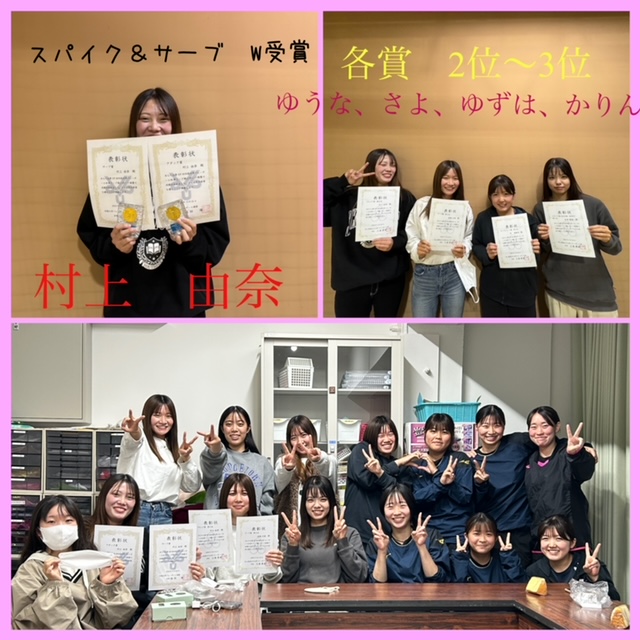 先日閉幕した秋季リーグの個人賞が発表されました。2023年度春季から導入された個人賞は4部門(スパイク賞、ブロック賞、サーブ賞、サーブレシーブ賞)で春季はブロック賞とサーブレシーブ賞を本学,村上由奈と丹唯珠羽が受賞しました。秋季リーグも4部門中2部門を村上由奈がW受賞しました😊🎉他にも2位,3位と良い結果を残すことができました。2.3位には顧問作成の賞状が渡されました。