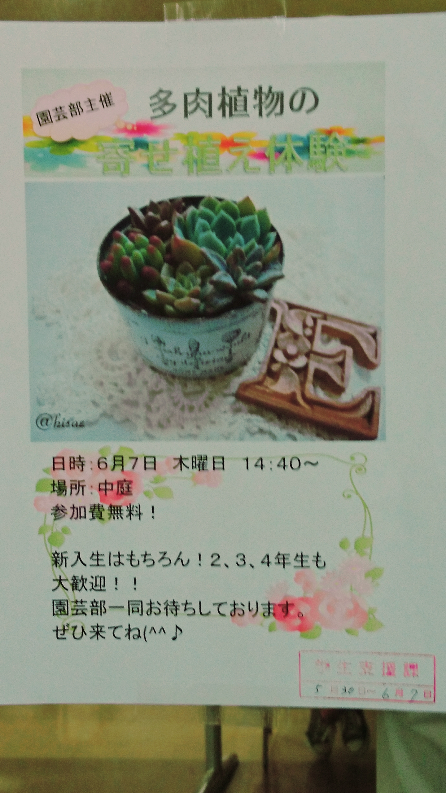きれいな色とりどりの花が咲いているので中庭付近を通る時に是非見てみてください(^^)