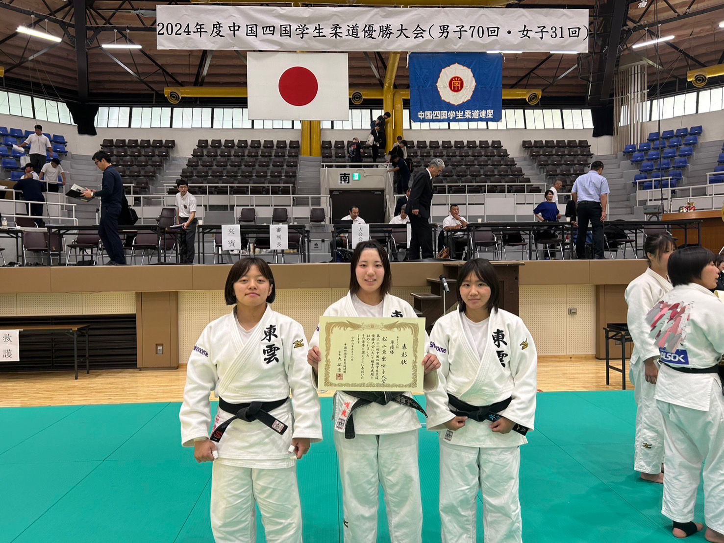 柔道部です!! 投稿日時: 2025年9月8日 投稿者: student こんにちは!柔道部です!8月30日に愛媛県武道館で行われた「2025年度 中国四国学生柔道体重別選手権大会」に3名の部員が出場しました! 結果を残すことはできませんでしたが、それぞれの強みや課題を見つけることができました。 自分の強みを活かせるようこれからも練習に励んでいきます! また、今大会の開会・閉会宣言を東雲女子大学の学生が代表して行いました!
