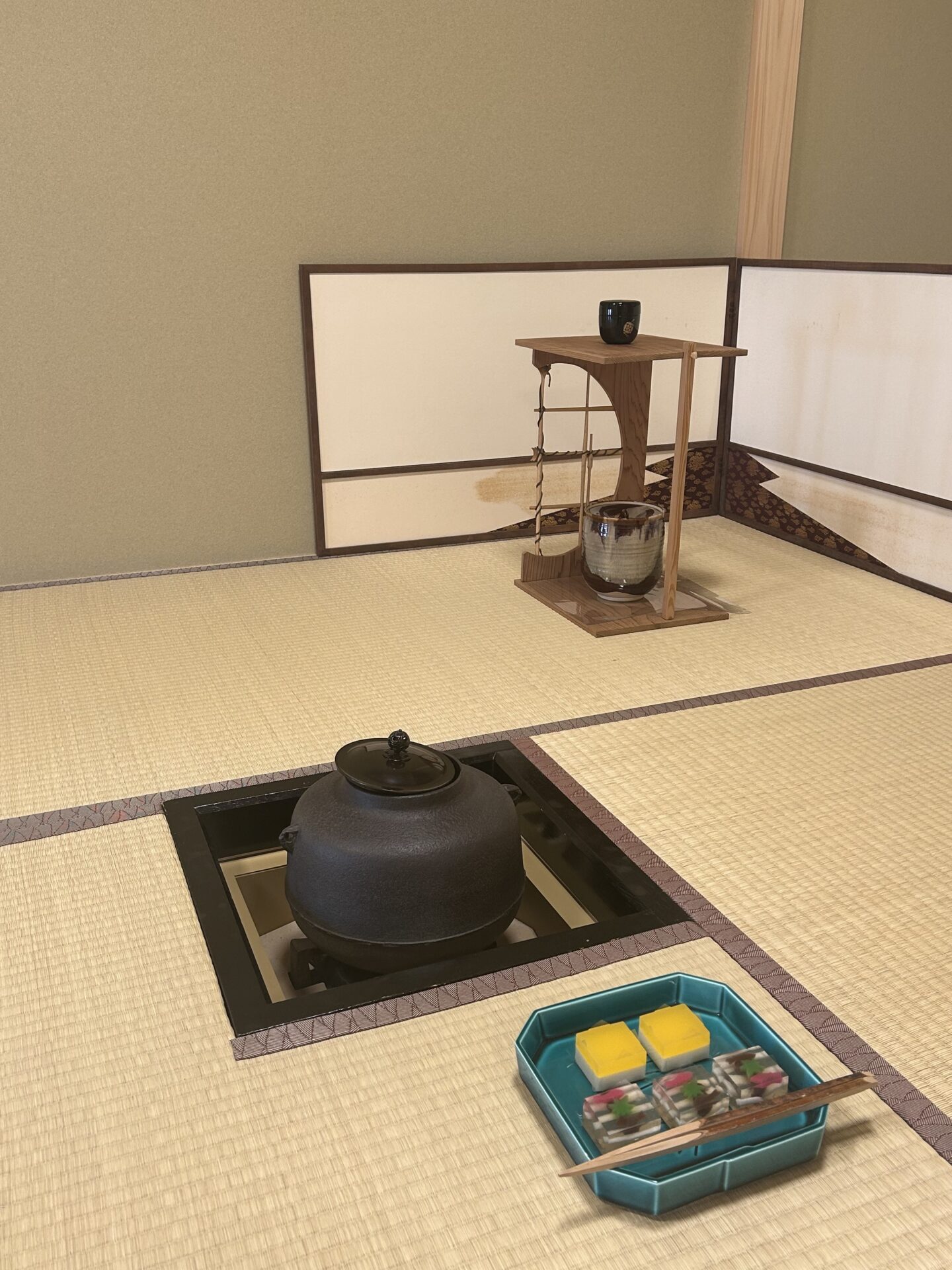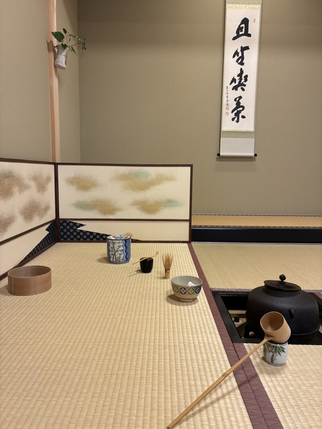 先生が溜精棚(りゅうせいだな)を組み立ててくださり、炉の稽古をしました。