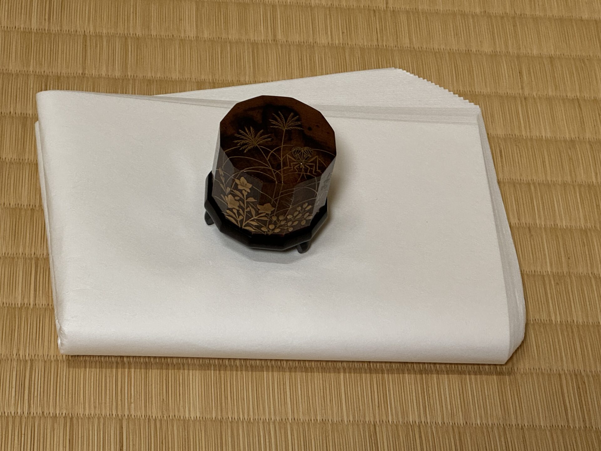 本来、炭火で湯を沸かしますが(大学の茶室の炉は電気コンロになっています)、最後に使い終わった炭火の中へ「お香」を入れ、茶室を良い香りで満たし、清めるそうです。