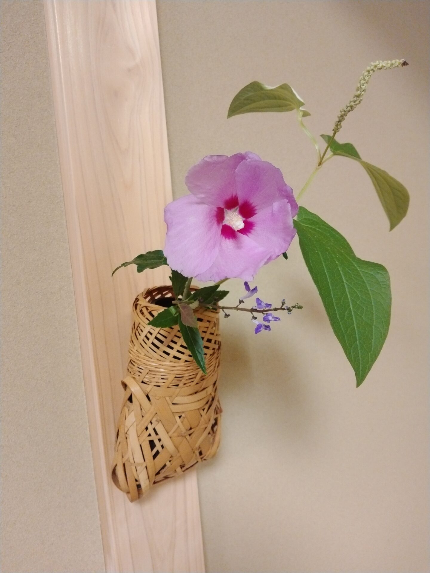 宗全籠に木槿(むくげ)、秋海棠(しゅうかいどう)、かや です。