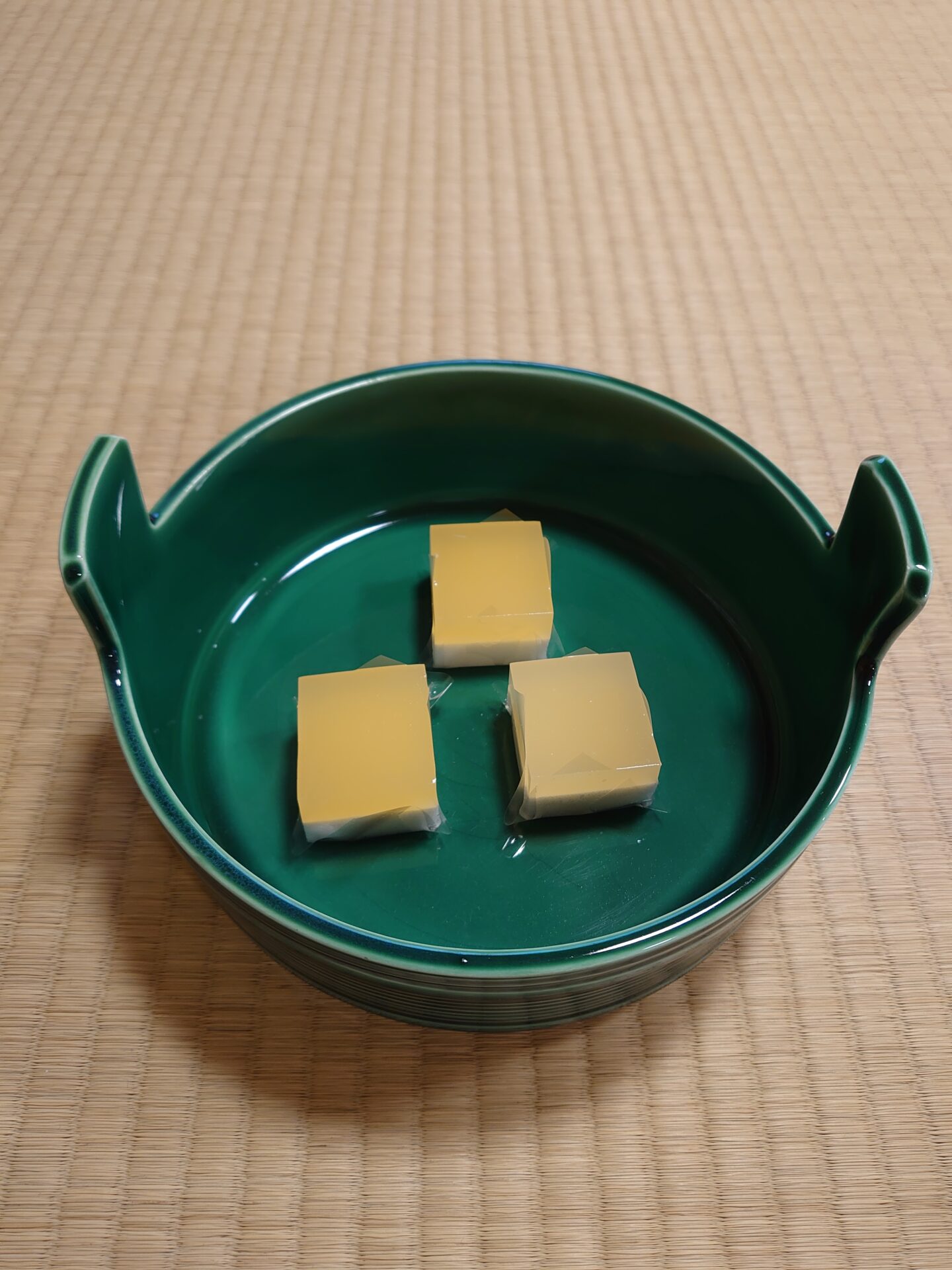 今日のお菓子は、「淡雪」です。卵白の寒天の上にみかん味のゼリーが乗ったお菓子でした。