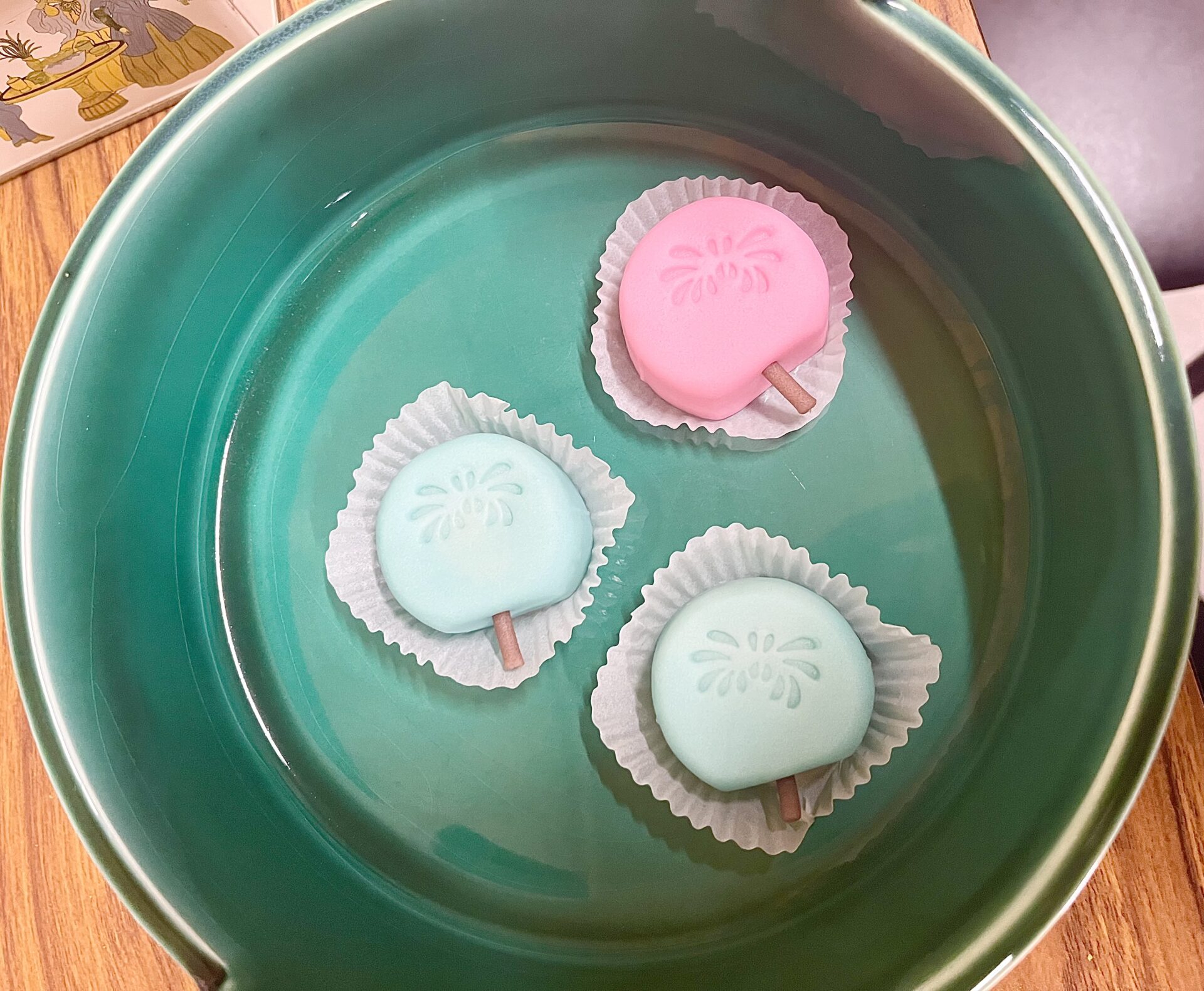 本日のお茶菓子は「うちわ」をモチーフにした練り物です。水色とピンク色の2種類を用意しました。見て涼をとれる、涼やかで可愛らしい見た目をしています。